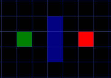 假设有人想从A点移动到一墙之隔的B点,如下图,绿色的是起点A,红色是终点B,蓝色方块是中间的墙。