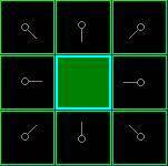 在这一点,你应该形成如图的结构。在图中,暗绿色方格是你起始方格的中心。它被用浅蓝色描边,以表示它被加入到关闭列表中了。所有的相邻格现在都在开启列表中,它们被用浅绿色描边。每个方格都有一个灰色指针反指他们的父方格,也就是开始的方格。