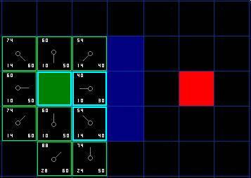 这样一来,就剩下了其他5格。当前格下面的另外两个格子目前不在开启列表中,于是我们添加他们,并且把当前格指定为他们的父节点。其余3格,两个已经在开启列表中(起始格,和当前格上方的格子,在表格中蓝色高亮显示),于是我们略过它们。最后一格,在当前格的左侧,将被检查通过这条路径,G值是否更低。不必担心,我们已经准备好检查开启列表中的下一格了。