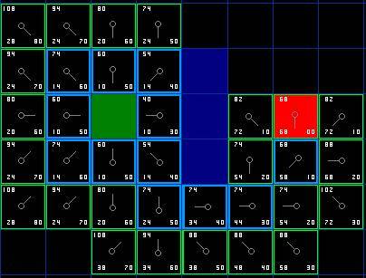 注意,起始格下方格子的父节点已经和前面不同的。之前它的G值是28,并且指向右上方的格子。现在它的G值是20,指向它上方的格子。这在寻路过程中的某处发生,当应用新路径时,G值经过检查变得低了-于是父节点被重新指定,G和F值被重新计算。尽管这一变化在这个例子中并不重要,在很多场合,这种变化会导致寻路结果的巨大变化。