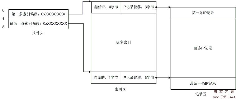 实在是很简单,不是吗?从文件头你就可以定位到索引区,然后你就可以开始搜索IP了!每条索引长度为7个字节,前4个字节是起始IP地址,后三个字节就指向了IP记录。这里有些概念需要说明一下,什么是起始IP,那么有没有结束IP? 假设有这么一条记录:166.111.0.0 - 166.111.255.255,那么166.111.0.0就是起始IP,166.111.255.255就是结束IP,结束IP就是IP记录中的那头4个字节,这下你应该就清楚了吧。于是乎,每条索引配合一条记录,构成了一个IP范围,如果你要查找166.111.138.138所在的位置,你就会发现166.111.138.138落在了166.111.0.0 - 166.111.255.255 这个范围内,那么你就可以顺着这条索引去读取国家和地区名了。那么我们给出一个最详细的图解吧: