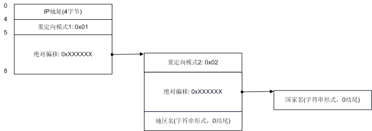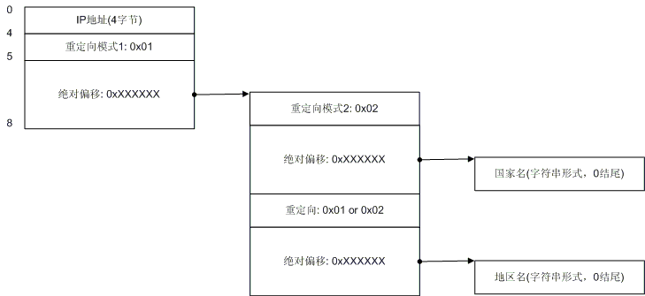 于是我们想象着一条记录的格式应该是: [IP地址][国家名][地区名],当然,这个没有什么问题,但是这只是最简单的情况。很显然,国家名和地区名可能会有很多的重复,如果每条记录都保存一个完整的名称拷贝是非常不理想的,所以我们就需要重定向以节省空间。所以为了得到一个国家名或者地区名,我们就有了两个可能:第一就是直接的字符串表示的国家名,第二就是一个4字节的结构,第一个字节表明了重定向的模式,后面3个字节是国家名或者地区名的实际偏移位置。对于国家名来说,情况还可能更复杂些,因为这样的重定向最多可能有两次。