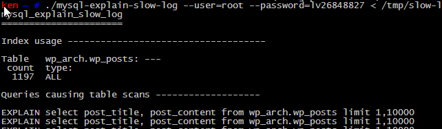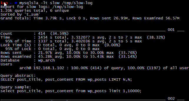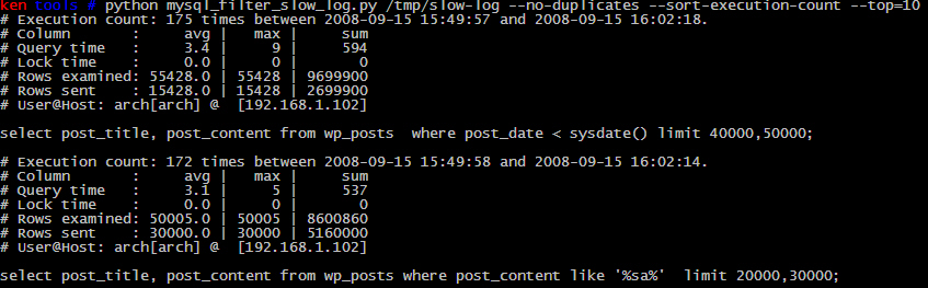 功能上, 列出了总的慢查询次数和类型, 去重后的sql语句, 执行次数及其占总的slow log数量的百分比.