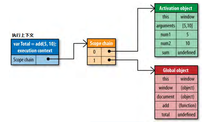 在执行add函数时,JavaScript引擎会创建一个新的执行上下文和一个包含this、arguments、num1、num2的活动对象,并把活动对象添加到作用域链中。在add()函数内部运行时,JavaScript引擎需要解析函数里的num1和num2标识符。var total = add(5, 10);