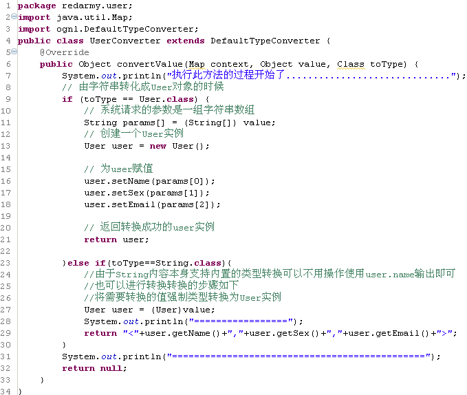实现类型转换器必须实现上面的TypeConverter,不过上面的接口里的方法过于复杂,所以OGNL项目还提供了一个该接口实现类:ognl.DefaultTypeConverter,通过继承该类实现自己类型转换器.该类定义如下: