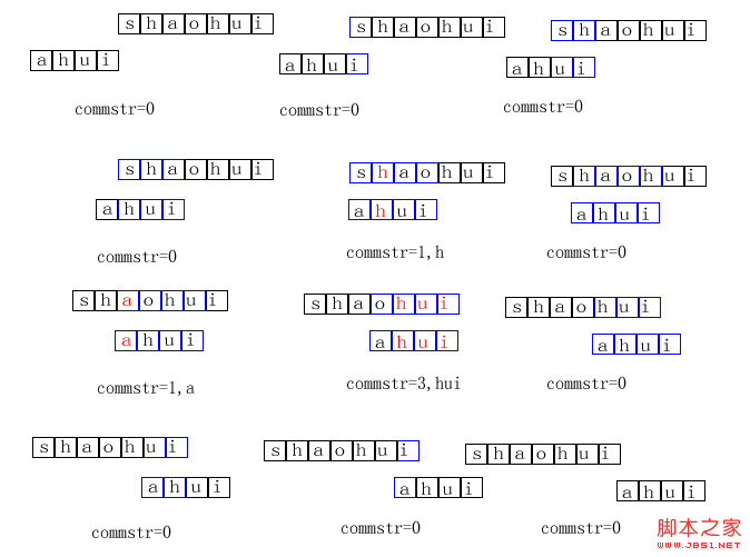 下图是求解过程的图示(下图有点错误,应该是将s2从右往左移动),蓝色部分表示重叠的字符串,红色的部分表示重叠部分相同的子串