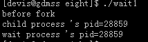 当程序运行的时候明显的可以看到在输出最后一行 的时候等待了三秒钟。也就是父进程等待子进程的结束。父进程才能扑捉子进程,然后得到wait要得到的结果。